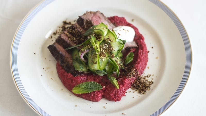 - To serve, drain off any excess liquid from the cucumber salad, then tear the mint into small pieces and fold in with the toasted sesame seeds. Arrange on plates with the slices of beef and a large dollop of the beetroot hummus drizzled with a little extra pomegranate molasses.