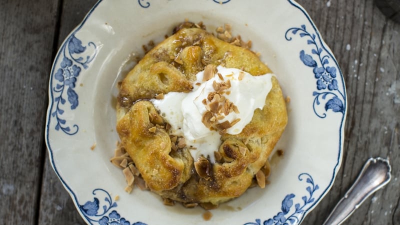 - Spread 2 tablespoons of frangipane in a circle in the centre of each disc leaving a 20 cm edge all around with no frangipane. Arrange the apple slices in a circle in the centre.