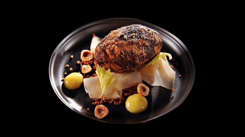 Pork braised in a cabbage and lemon broth, with baby potatoes, greens and pickled onions.