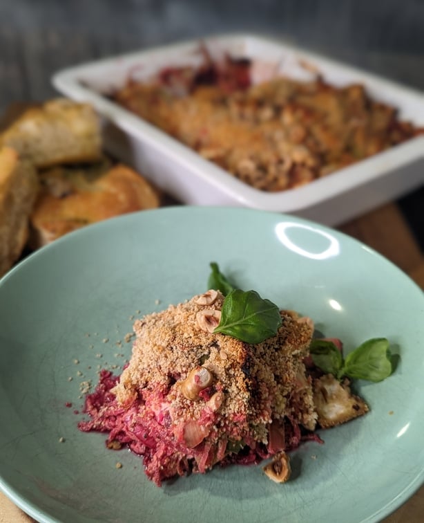- Stir through the beetroot, rosemary, crème fraiche and salt.Scatter over some freshly ground black pepper, then top with the goat's cheese, breadcrumbs and hazelnuts.