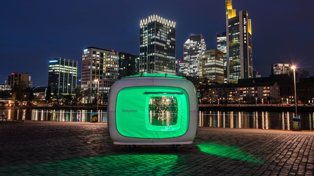 - A Sleeperoo pop-up sleeping cube, made from sustainable materials, in central Frankfurt, Germany.
