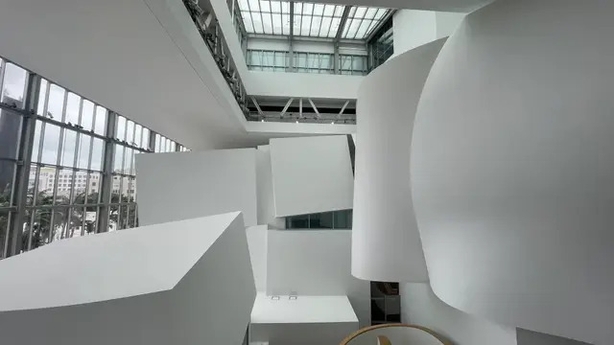 As I stand in the giant lobby, my eyes follow the curves of the staircases and balconies as they fold in on each other up to the ceiling.