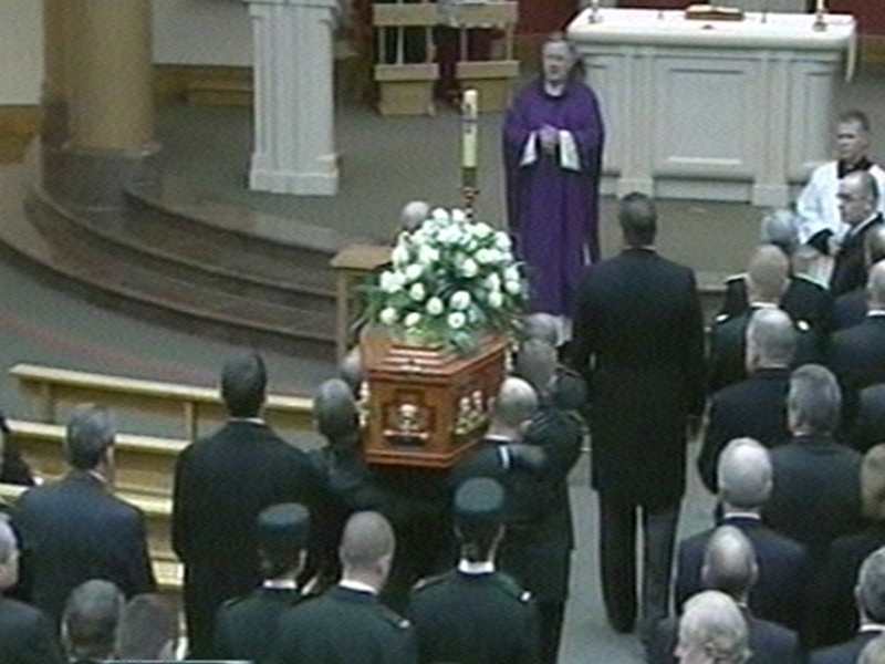 Tá na mílte ag freastal ar shochraidh an Chonstábla Stephen Carroll atá ar siúl i nDroichead na Banna, i gContae an Dúin fé láthair.
