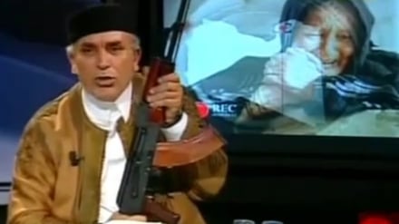 1605 A newsreader for Libyan State television has appeared on screen, brandishing an automatic rifle and pledging to sacrifice his last breath, last bullet, last drop of blood, last baby and child for Muammar Gaddafi.