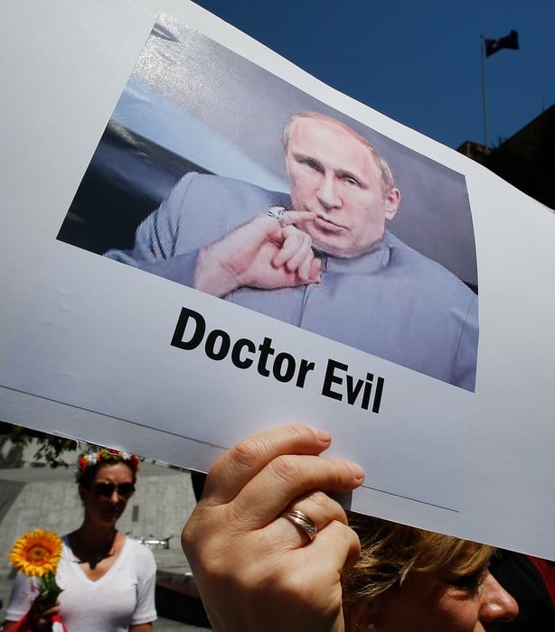 Draped with the flags of the nations that lost citizens when the flight MH17 was shot down, the demonstrators lay on a large Ukrainian flag, in what they said was a protest at the "murderous acts" Russia's president was responsible for.