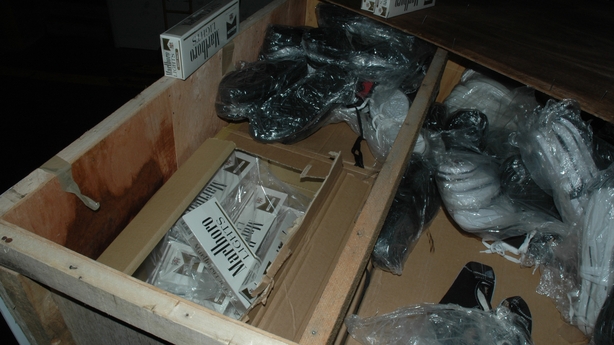 According to documentation, the crate contained safety footwear, but when examined it was found to contain cigarettes hidden underneath a layer of shoes.
