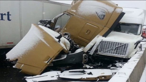 This is the miraculous moment a driver survived after being crushed between two big metal trailers in a pile-up on an icy motorway in the United States.