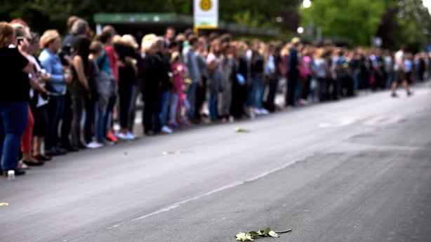 Hundreds of people lined the street outside the Joseph Koenig high school in the small town of Haltern am See near Duesseldorf where 16 students who died on 24 March had attended classes.
