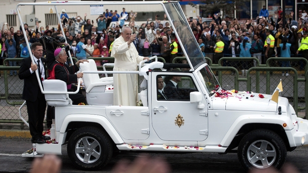 Tens of thousands lined the streets as Francis' motorcade drove into Quito, some pushing through a police line. Well-wishers threw gifts at the pope mobile, including two live white doves.