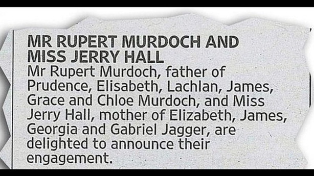 The notice read: "Mr Rupert Murdoch, father of Prudence, Elisabeth, Lachlan, James, Grace and Chloe Murdoch, and Miss Jerry Hall, mother of Elizabeth, James, Georgia and Gabriel Jagger, are delighted to announce their engagement."