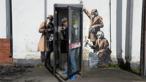 The piece, titled "Spy Booth", depicted three men in trench coats using listening devices to tap into conversations at an actual public telephone box in Cheltenham, southwest England.