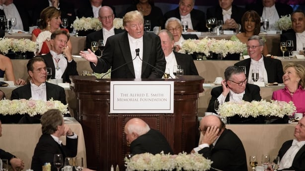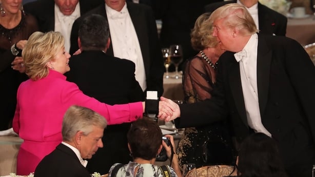 US presidential campaign tensions seeped into proceedings as Mr Trump joked about sending Mrs Clinton to prison and she alluded to Mr Trump's statements about women by estimating how he might rate the Statue of Liberty's attractiveness a four, maybe a five.