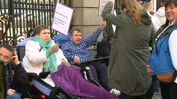 Several dozen protesters, many of them in wheelchairs, have gathered outside Leinster House for a protest which they have vowed to continue overnight.