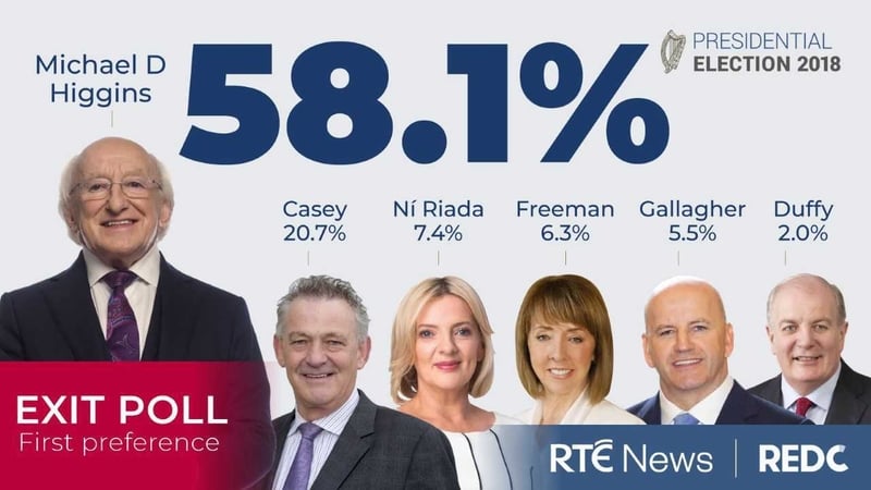 An RTÉ exit poll conducted by Red C suggests Michael D Higgins is on course to be re-elected President, with the polling figures suggesting he will receive 58.1% of the first preference votes.
