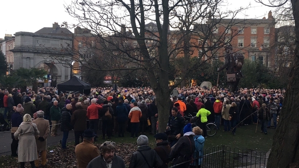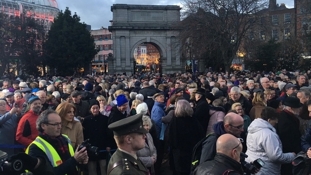 Crowds have gathered at St Stephens Green for a ceremony to mark the removal of the Hauntings Soldier statue.
