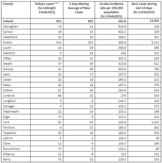 Counties with the highest number of infections include Monaghan (514.8), Carlow (402.2) and Waterford (388.2). Those with the lowest disease rate include Kerry (129.3), Kilkenny (132) and Roscommon (133.2).