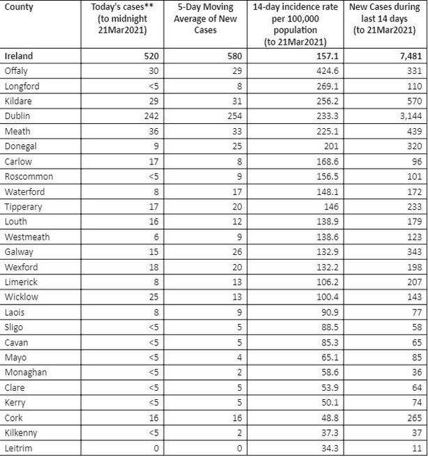 Geographically, 242 cases were confirmed in Dublin, 36 in Meath, 30 in Offaly, 29 in Kildare, and 25 in Wicklow, with the remaining 158 cases spread across 20 other counties.