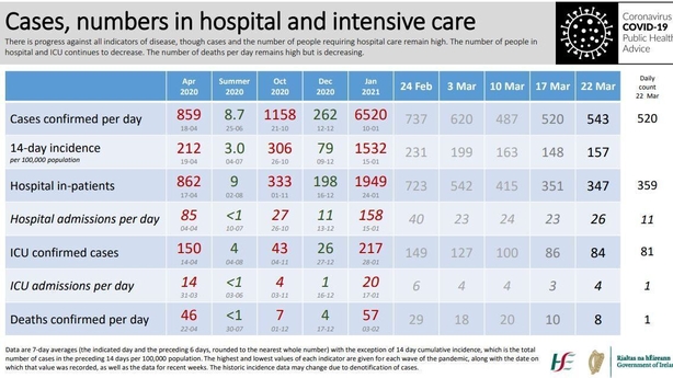 The number of people hospitalised with the virus stands at 359, while the number in ICU has fallen slightly to 81. There were 14 further hospitalisations in the past 24 hours.