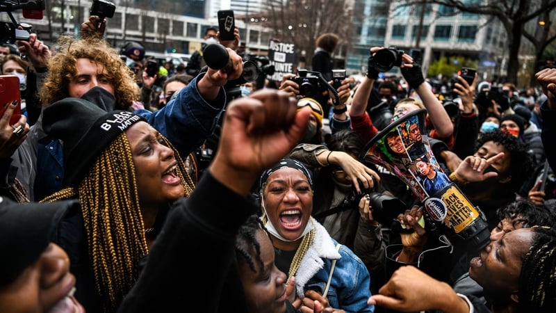The name of #GeorgeFloyd is being chanted by crowds gathering outside the Minneapolis courthouse where #DerekChauvin has just been convicted. @rtenews pic.twitter.com/2eb4e3PUz3
