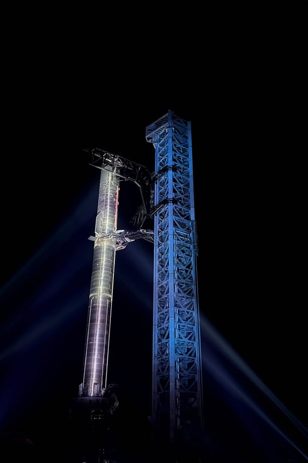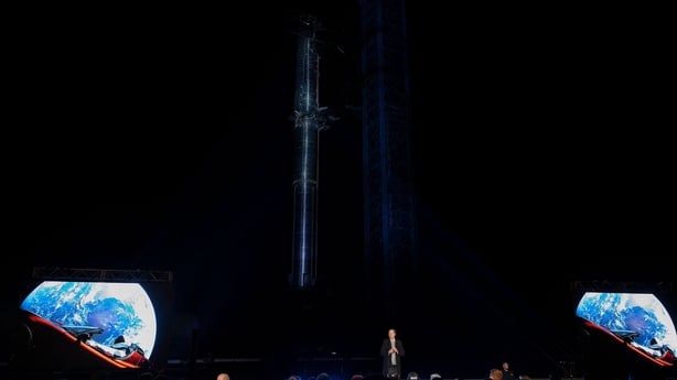 Mr Musk was speaking against the impressive backdrop of the spacecraft in its fully-stacked configuration, standing 120 metres tall, with a matte black upper-stage placed on a shimmering silver Super Heavy first-stage rocket.
