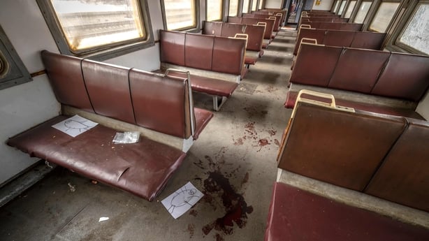 Around 30 bodies, all in civilian clothing, were grouped together and placed under plastic sheets next to a kiosk daubed yellow and blue - the colours of Ukraine's flag - outside the station, where blood pooled on the ground.