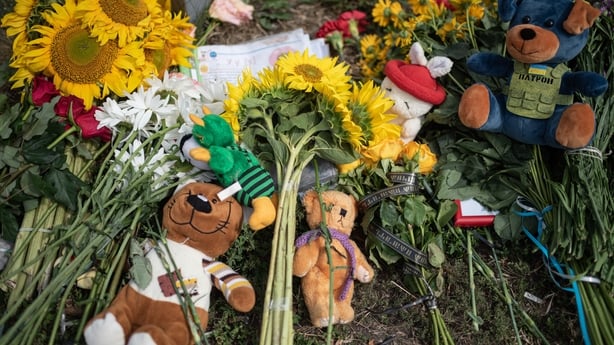 Residents placed teddy bears and flowers at a makeshift memorial near the site of the strike.