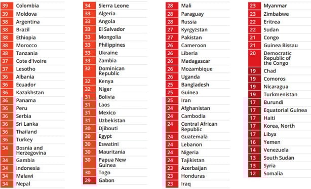 The index ranks 180 countries and territories by their perceived levels of public-sector corruption according to experts and businesspeople.