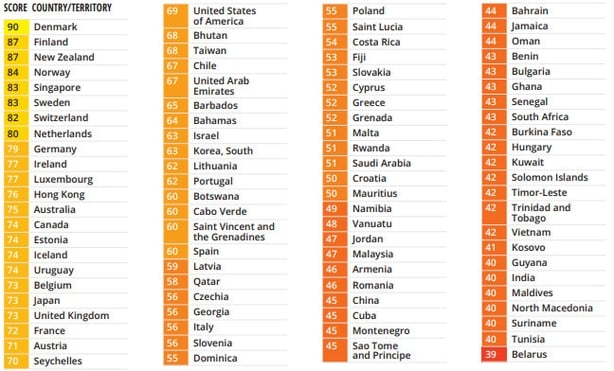 It relies on 13 independent data sources and the higher a country’s score, the less it is perceived to be affected by public-sector corruption.