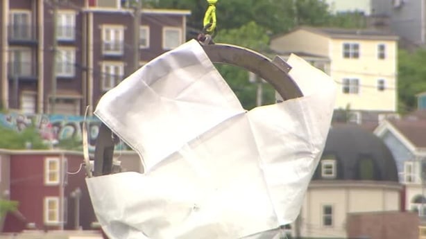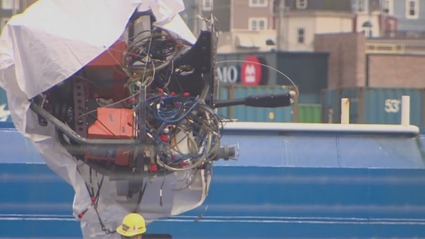 The images showed a crane unloading the wreckage from the Horizon Arctic ship in the city's harbour.