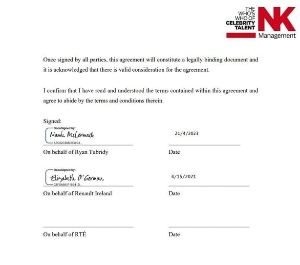 He said it was signed by someone on behalf of Mr Tubridy and dated 21 April 2023, 15 April 2021 by Renault, but not signed by RTÉ at all.