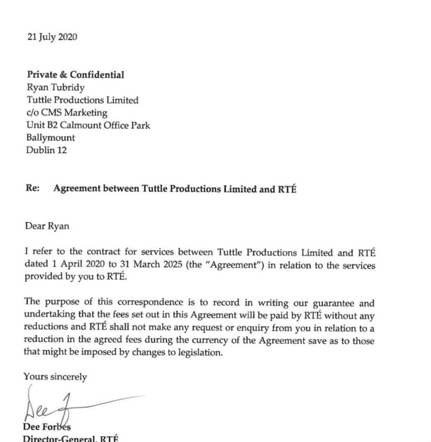 In the correspondence she assured Mr Tubridy then that the income set out in his 2020-2025 contract would be paid in full by RTÉ and he would not be asked to take a pay cut.