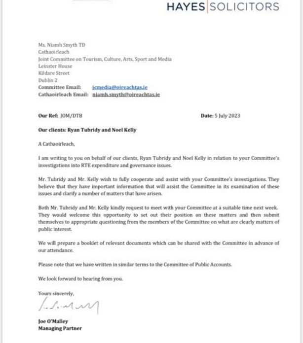 Before today's committee meeting, TDs and Senators were forwarded a letter from the former Director General Dee Forbes wrote to Mr Tubridy in July 2020.