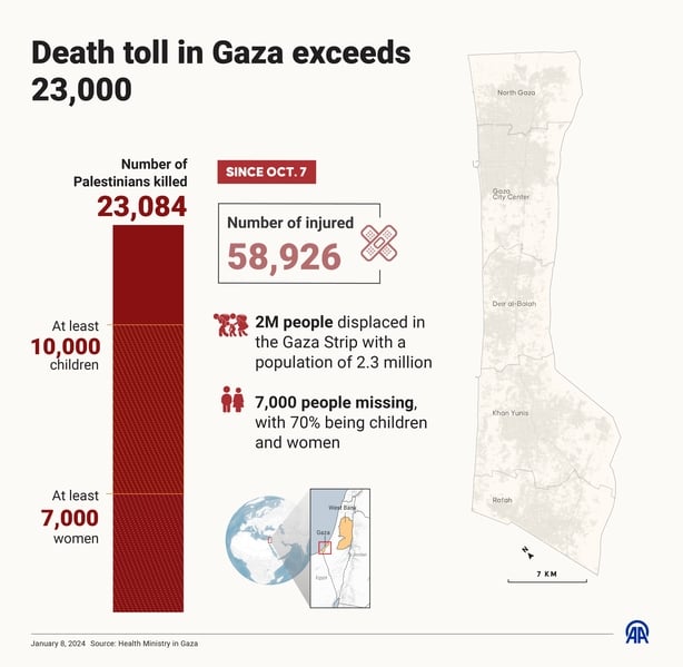 The Israeli offensive has so far killed 23,084 Palestinians, Gaza health officials say, while Israel says Hamas still holds more than 100 hostages of the 240 seized during its attack on Israeli towns on 7 October in which the militants killed about 1,200 people.