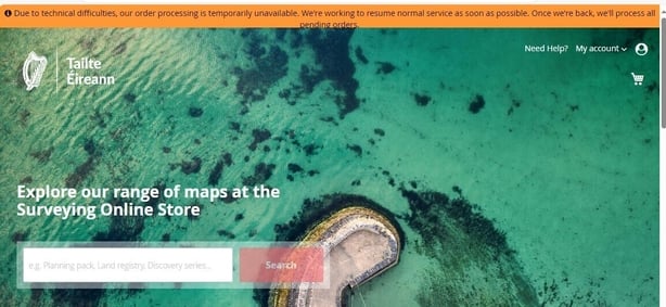 Users of the Tailte Éireann site who click a link to purchase a map from its online store are greeted with a warning message that reads: "Due to technical difficulties, our order processing is temporarily unavailable. We're working to resume normal service as soon as possible. Once we're back, we'll process all pending orders."
