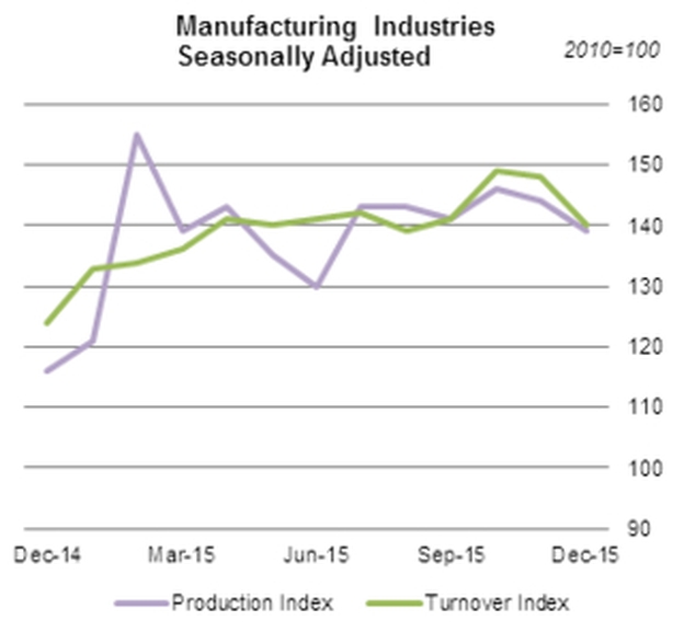 There was a decrease of 5% in the seasonally adjusted industrial turnover index for Manufacturing Industries in December 2015 when compared with November 2015, while annually turnover increased by 13.3%.