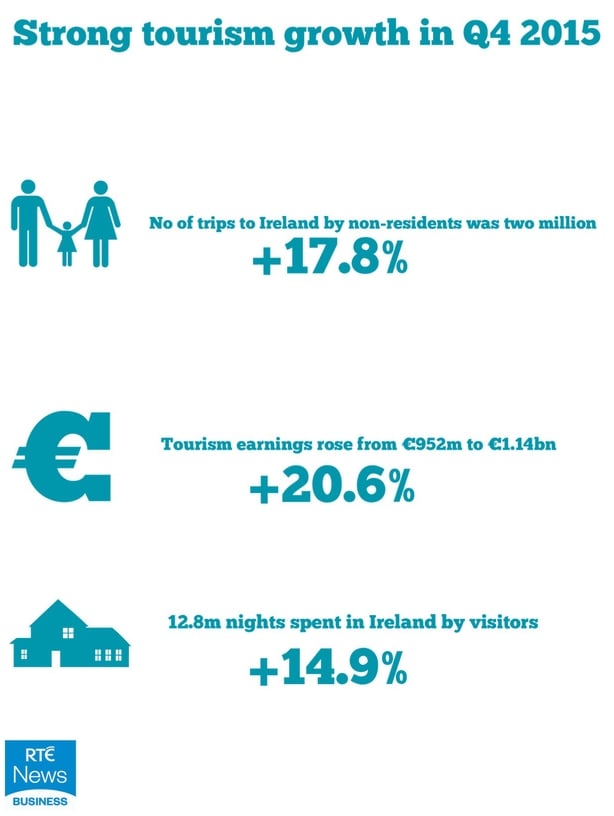 The statistics indicate that year-on-year tourism earnings from overseas travellers rose from €952m to €1.14bn for the final quarter of 2015.