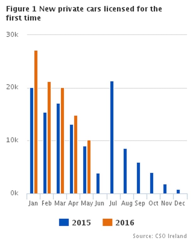 Latest figures from the Central Statistics Office also show a total of 5,488 used (imported) private cars were licensed here – an increase of 46.4% on May last year.