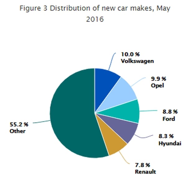 Meanwhile, Volkswagen (1,010) was the most popular make of new private cars licensed in May, followed by Opel (1,000), Ford (891), Hyundai (845) and Renault (792).