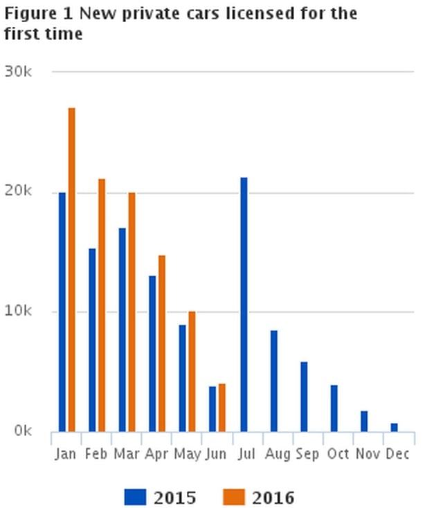 The number of new cars licensed during each month so far in 2016 has been higher than for the corresponding months last year.