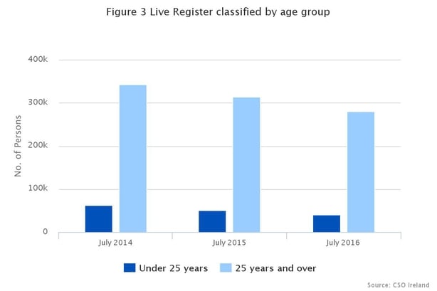 In the year to July, the number of people over the age of 25 on the Live Register fell by 33,888 (-10.8%), while the fall for under 25s was 10,446 (-20.8%).