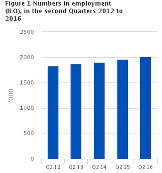 There was annual increase of 2.9% or 56,200 in the number of people with jobs between April and June, bringing total employment in the country to 2,014,900.
