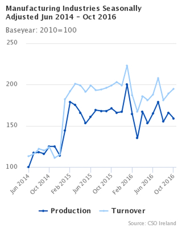 Meanwhile, according to the CSO turnover increased by 3% for manufacturing industries in October when compared with September, while annually turnover fell by 2% when compared with October 2015.