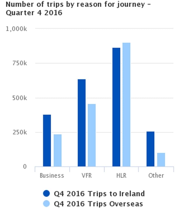 Meanwhile, the number of trips made by Irish residents overseas between October and December increased by 10% from in Q4 2015 to 1.7m.