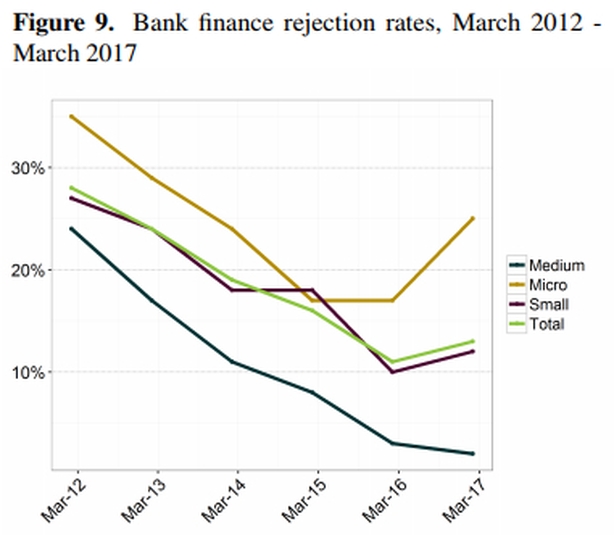 Despite an overall rise in the level of lending to SMEs, the rejection rate on bank finance applications increased from 11% to 13% between Q1 of this year and the same period in 2016.