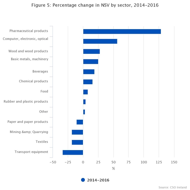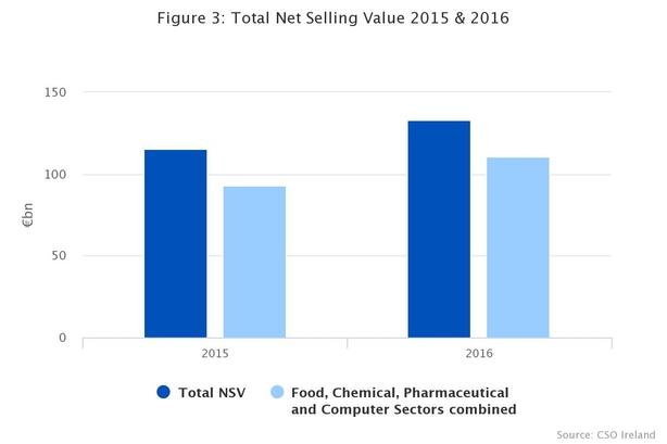 The most significant increase in NSV was in the pharmaceutical sector, with basic pharmaceutical products and preparations increasing by 128.5% over a two-year period – from €25.5 billion in 2014 to €58.3 billion in 2016.
