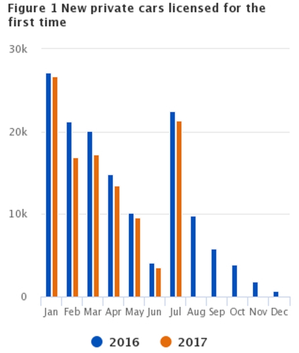 For the year to July, new car registrations are down by 9.4% to 108,662 when compared with the same time a year ago.