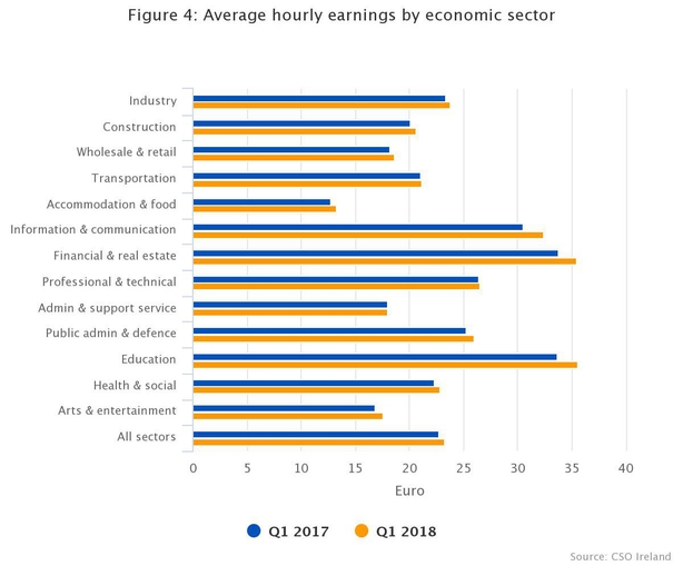 Today's CSO figures also show that average hourly earnings increased by 2.7% between the first quarter of 2017 and the first quarter of 2018, rising from €22.69 to €23.31.