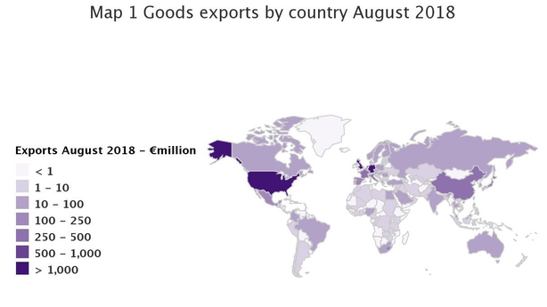 The US was the main non-EU destination accounting for 27% of total exports in August 2018.