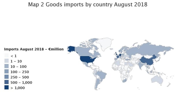 Imports from the EU made up 59% of total imports in August 2018, an increase of 21%) over the same month last year.