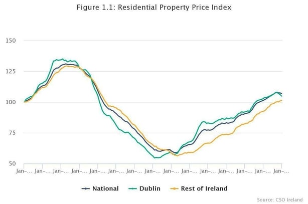 Dublin residential property prices have risen 92.3% from their February 2012 low, while residential property prices in the Rest of Ireland are 80.1% higher than the trough in May 2013.